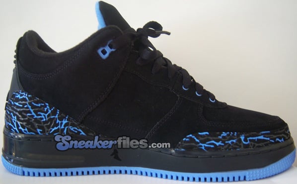 The uppers on this Air Jordan Force Fusion 3 Black / University Blue - Anthracite feature a Black suede, air bubble at the heel, and University Blue mixed with Anthracite elephant print around the toe box and heel. Releasing July 30th 2008.